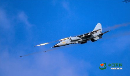 “航空飞镖”竞赛中,中国空军飞豹发射火箭弹瞬间。