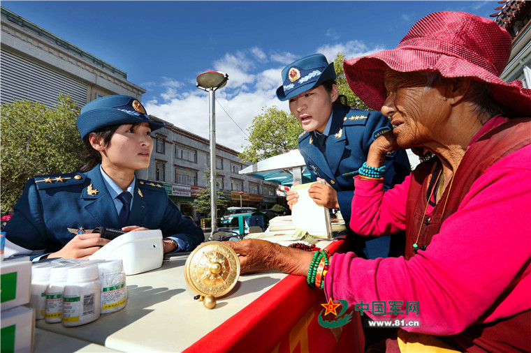 9月17日上午,医疗服务队官兵在拉萨街头为藏族群众开展便民服务。温志军 摄