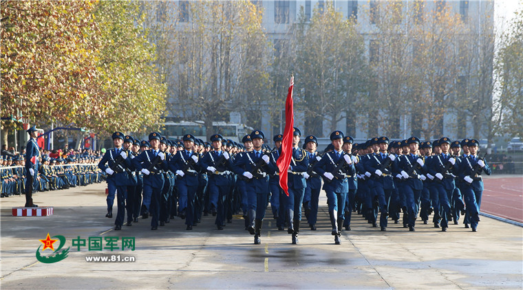 军乐激越,斗志昂扬。8:05,分列式阅兵开始。在护旗方队的引领下,持枪方队和徒手方队共9个方阵动地而来。方队人员全部由校机关、基层官兵和在校学员组成,他们历经两个余月的艰实训练,只为今天为人民空军奉上一份特殊而有意义的庆生礼物。