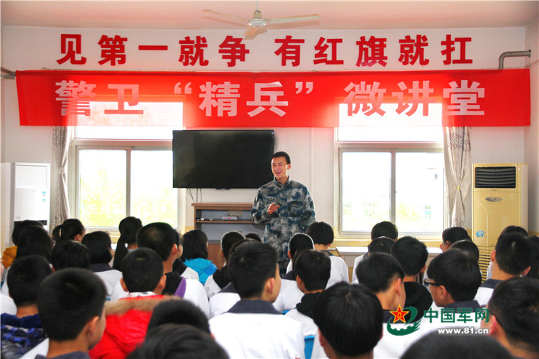 警卫“精兵”微讲堂开讲啦,阳光帅气的“90后”排长柯凯文分享自己的军旅历程,令同学们对参军入伍兴趣十足,对军营生活充满向往之情。