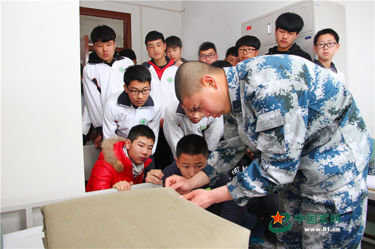 同学们现场观看兵哥展示叠“豆腐块”绝活,真起劲儿!