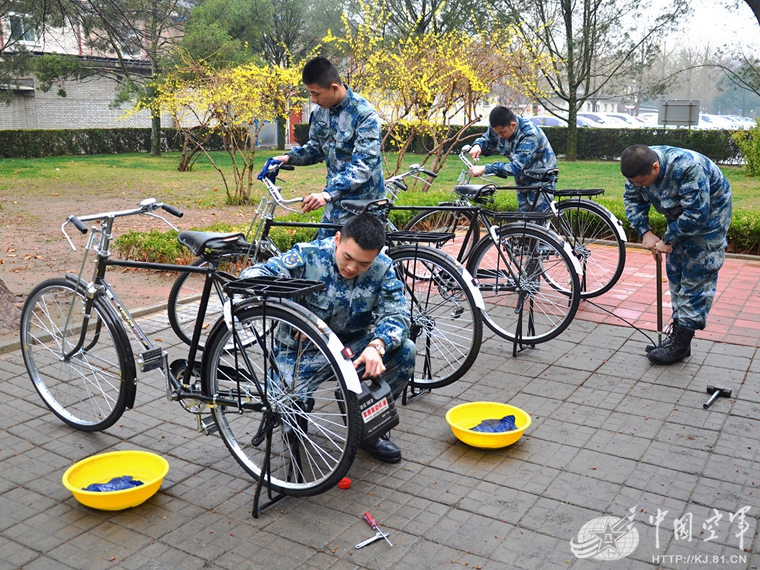 战士们在擦自行车。