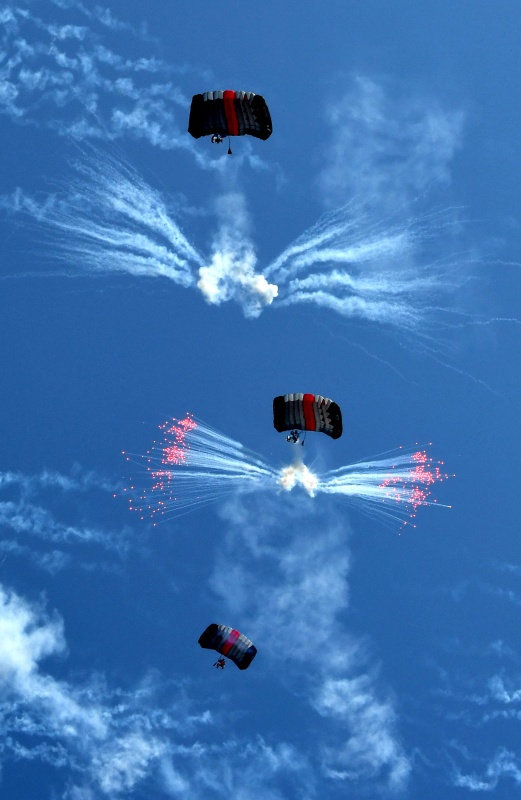 4月27日,跳伞员在郑州航展开幕式上进行跳伞表演。新华社记者