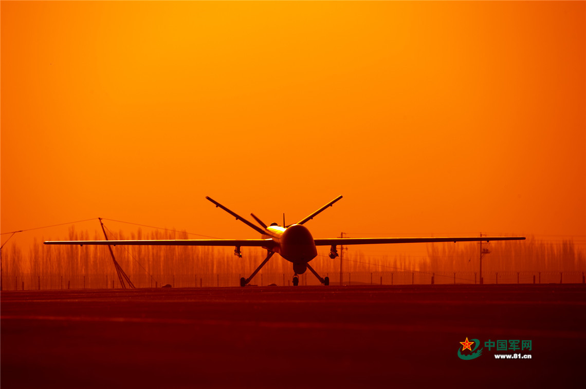 披着霞光,中国无人机从戈壁大漠起飞。杨军摄影