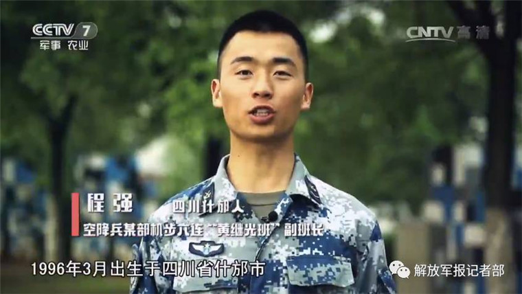 程强,四川什邡人,1996年出生。2008年汶川大地震,他与参与救援的空降兵部队结缘。2013年9月,程强参军入伍,毅然选择了空降兵部队,凭借过硬素质,新兵结束后他被分到了“黄继光连”。