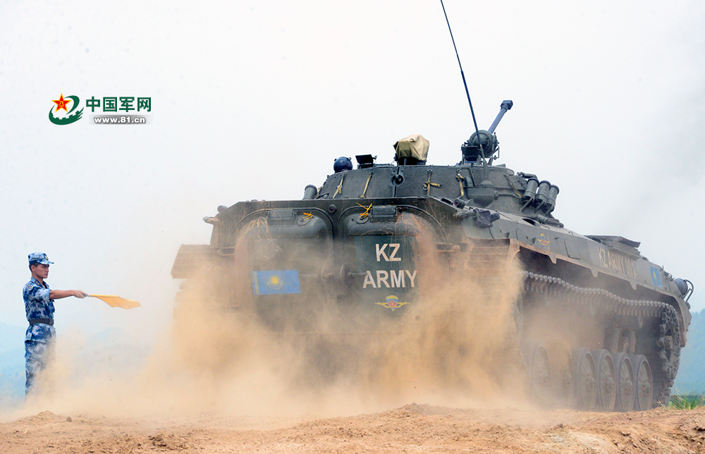 哈萨克斯坦战车驶出射击区。方超摄