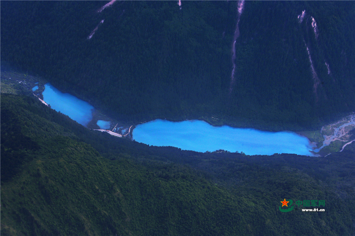 西部战区空军赴九寨沟震区空域航拍侦察:海子幽蓝清澈