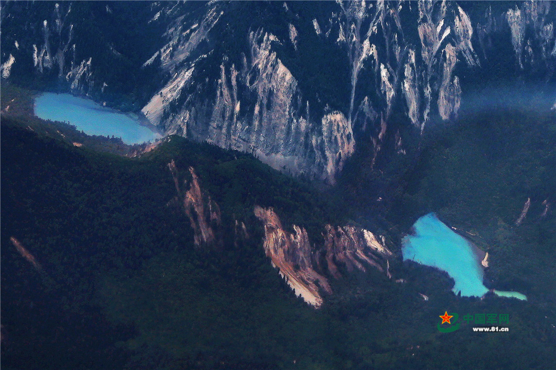 西部战区空军赴九寨沟震区空域航拍侦察:海子幽蓝清澈