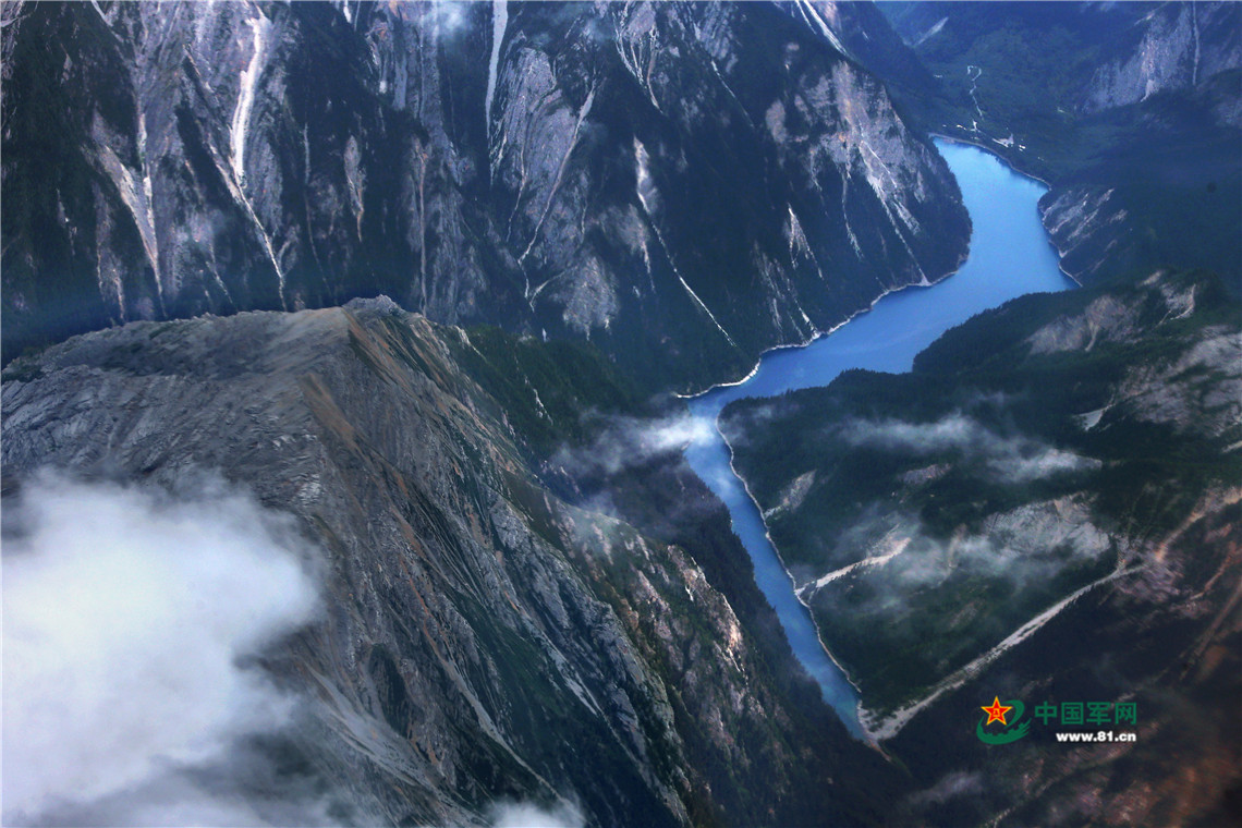 西部战区空军赴九寨沟震区空域航拍侦察:海子幽蓝清澈