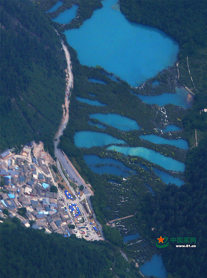 西部战区空军赴九寨沟震区空域航拍侦察:海子幽蓝清澈