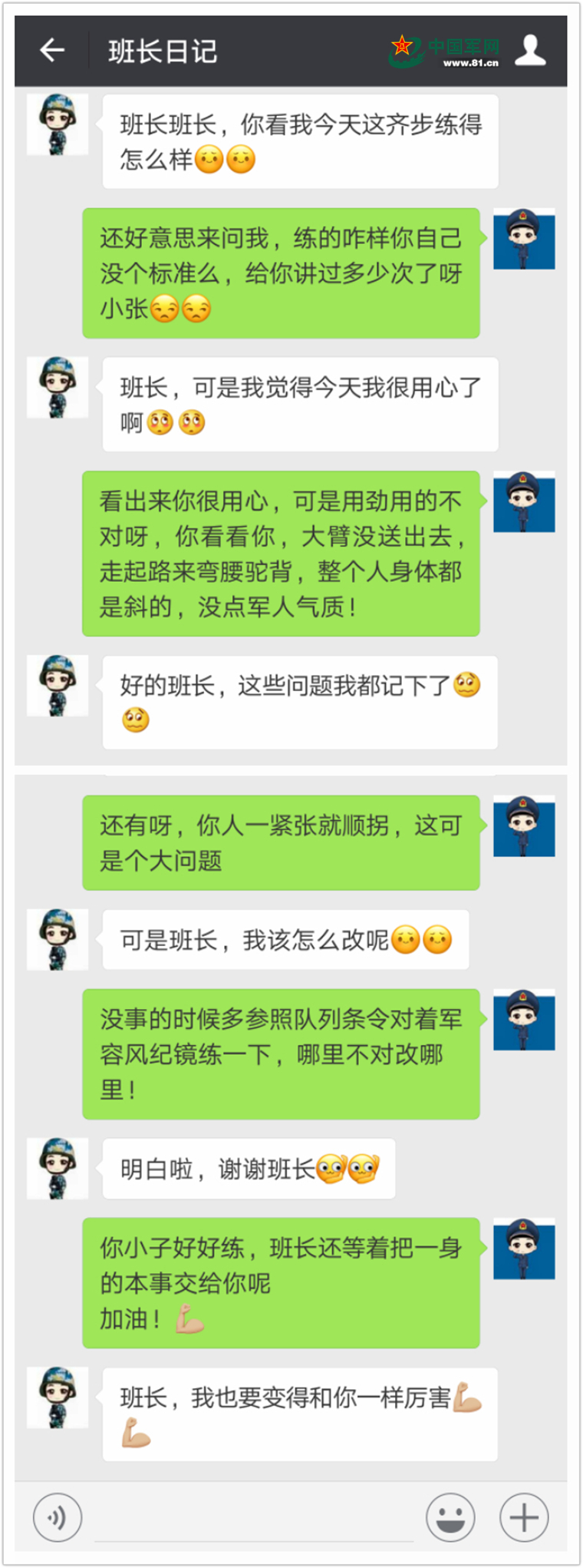不知不觉,新兵开始新训已经快两个星期了,他们正在经历着属于他们的“兵之初”,这其中有取得进步时的成功喜悦,也有遭遇挫折时的惆怅落泪,但是对待形形色色的新兵,班长是如何应对这些“熊孩子”的呢?下面让我们一起走进中部战区空军某新训旅,看看班长与新兵的聊天记录,感受一下他们之间的小故事吧。