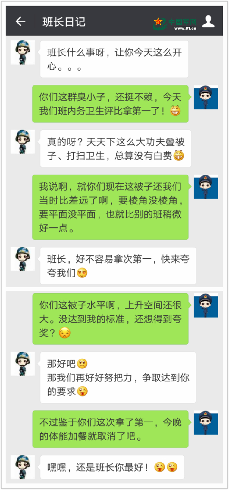 今天,新兵班内务卫生评比得了第一,新兵们受到了班长的表扬与鼓励,还额外给了他们“小奖励”,但是不能骄傲哦!
