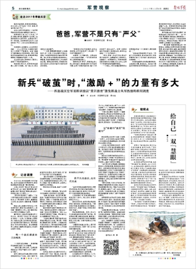 谈及自己在新训旅的成长进步,心理年龄明显大于同龄人的吴晃告诉记者,“赏识教育”的理念有利于激发官兵的进取心,激发个体的巨大潜能。