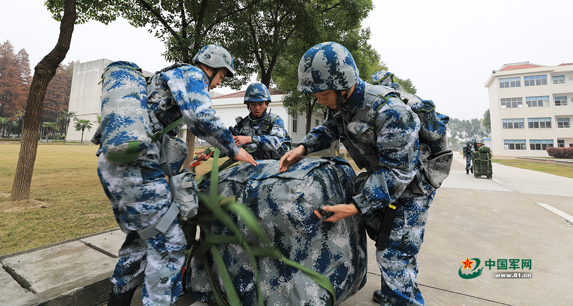 模拟伞降后,官兵们正在解脱空投的战备物资。
