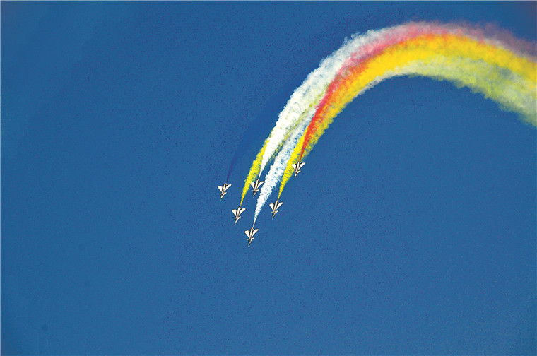 随着一声令下,3架喷涂八一军徽的歼-10表演机加速滑跑,呈“品”字形直刺苍穹;间隔8秒,另外3架歼-10表演机呼啸着组成箭形编队融入蓝天……6架飞机以密集的队形和整齐划一的动作,引来现场观众的赞誉。