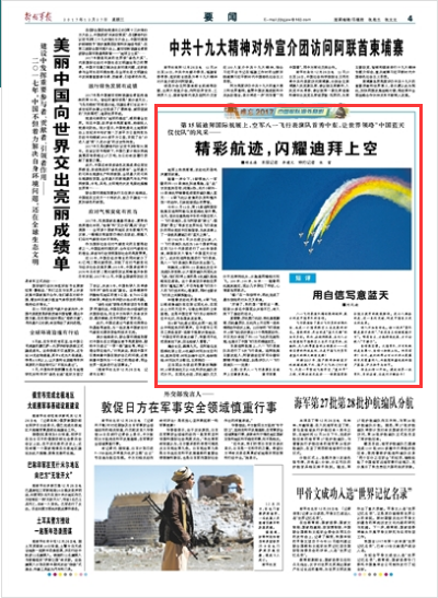 飞行表演除了展示飞行员的训练水准,也是一个国家航空工业发展的标志。看热闹的,关注的是“蓝天之舞”的炫目多彩。然而,在迪拜航展,业内人士也留意到中国航空工业关于直升机、运输机、无人机等装备的立体展示——这些宝贵的科技成就,正是中国飞行员写意蓝天的强大物质支撑!