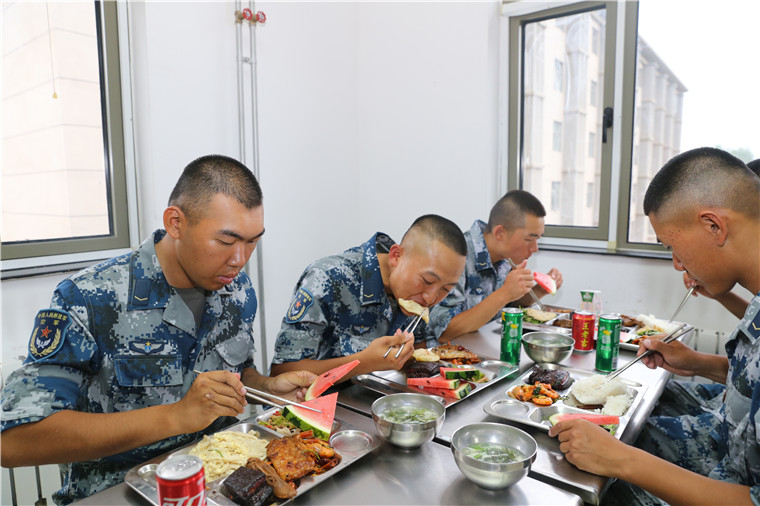 一天的舟车劳顿,新兵们早已是饥肠辘辘。炊事班为新战友们准备了丰盛的晚餐,荤素搭配,营养均衡,看得大家眼花缭乱、垂涎欲滴。大家齐聚一堂,大快朵颐,一天的劳累瞬间烟消云散。