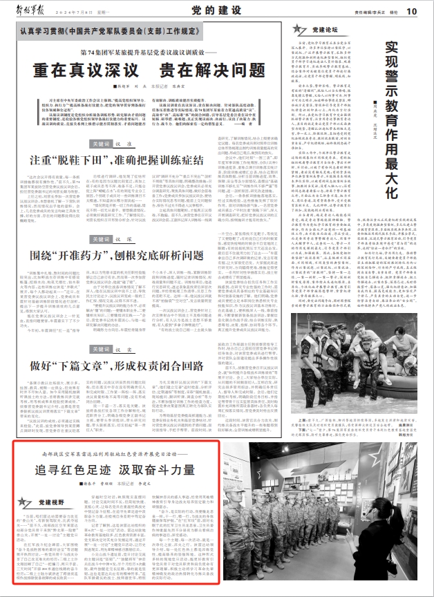 小尖山战斗遗址前,党日讨论交流的主题词是“坚韧”。“‘独腿将军’钟赤兵在战斗中中弹9发,半个月经历3次截肢,最终独腿走完长征路,靠的就是坚韧,这也是雷达兵应有的精神传承。”连队军龄最长的战士、技师唐世华,特别钦佩钟赤兵的感人事迹,经常用英雄精神教育引导身边战友培养坚定毅力和顽强意志。