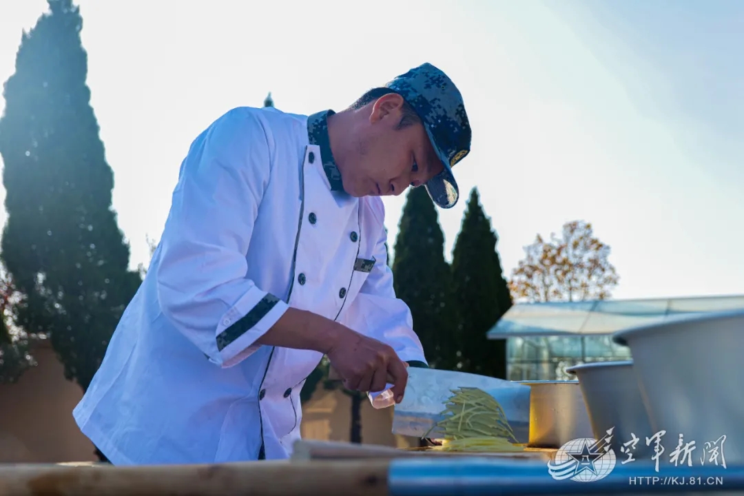 随着一声哨响,比武正式开始。A组9名官兵随即进入“战”位展开作业,建台搭灶、架锅生火,一气呵成。推刀直切,甩刀发力。他们下刀稳准,刀起刀落间,一个个薄厚均匀的土豆片,变成了粗细相近的土豆丝,展现出选手们卓越的刀工和高超的厨艺。