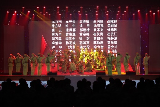 演出接近尾声,“风烟滚滚唱英雄,四面青山侧耳听……为什么战旗美如画,英雄的鲜血染红了她!为什么大地春常在,英雄的生命开鲜花!”《英雄赞歌》响起,屏幕上缓缓出现抗美援朝英烈名单,大家起立齐向屏幕敬礼。现场很多官兵眼睛都泛起了泪花。