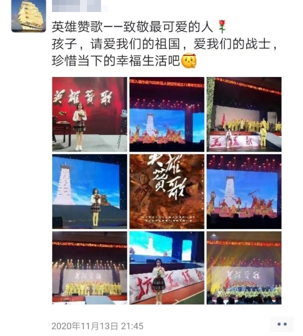 参演的一名小学生前期并不完全了解抗美援朝的历史,但三次彩排下来,从一开的懵懂陌生到最后敬畏、感动。她的母亲在朋友圈中勉励她道:“孩子,请爱我们的祖国,爱我们的战士,珍惜当下的幸福生活吧!”