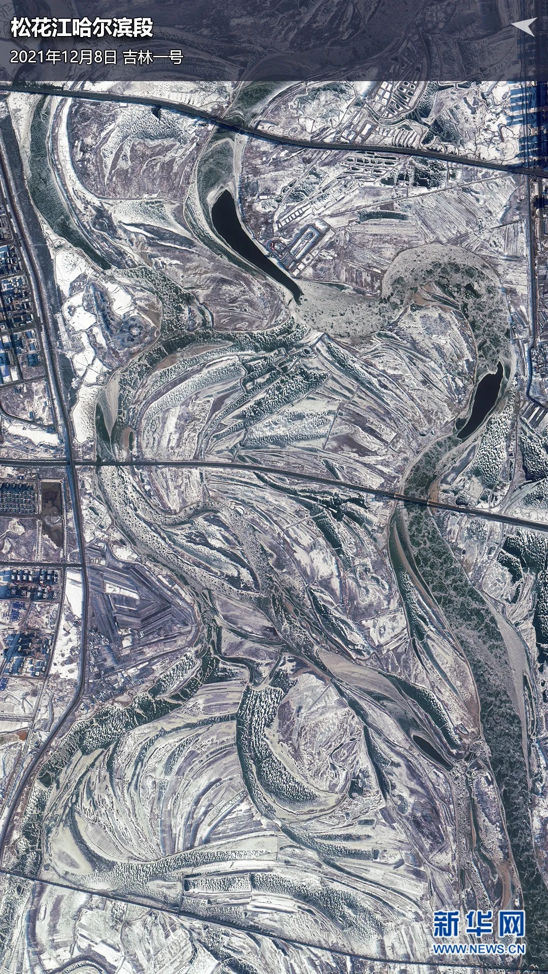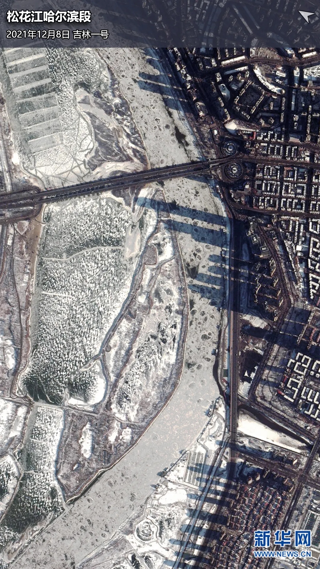 ▲卫星视角下的松花江哈尔滨段,被冰封的松花江清晰可见。卫星数据来源:吉林一号