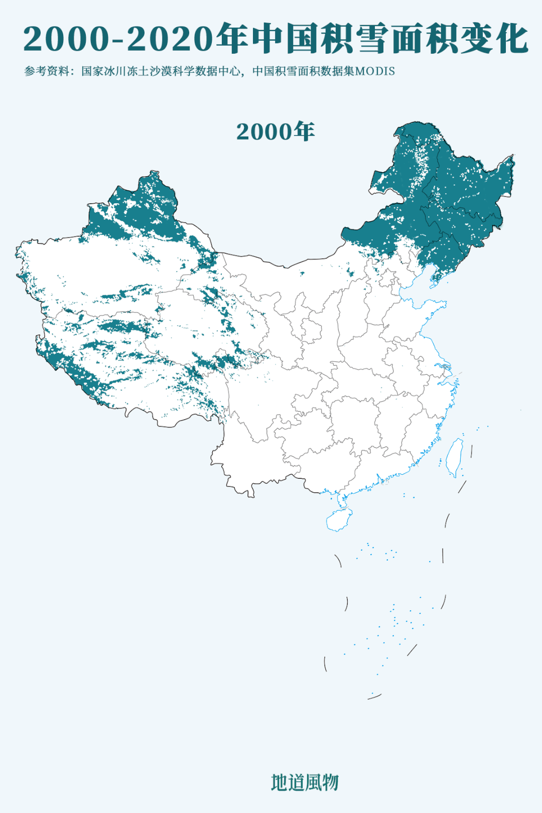 ▲2000-2020年中国积雪面积变化,深绿色为积雪区域。来源:地道风物(制图/孙璐)