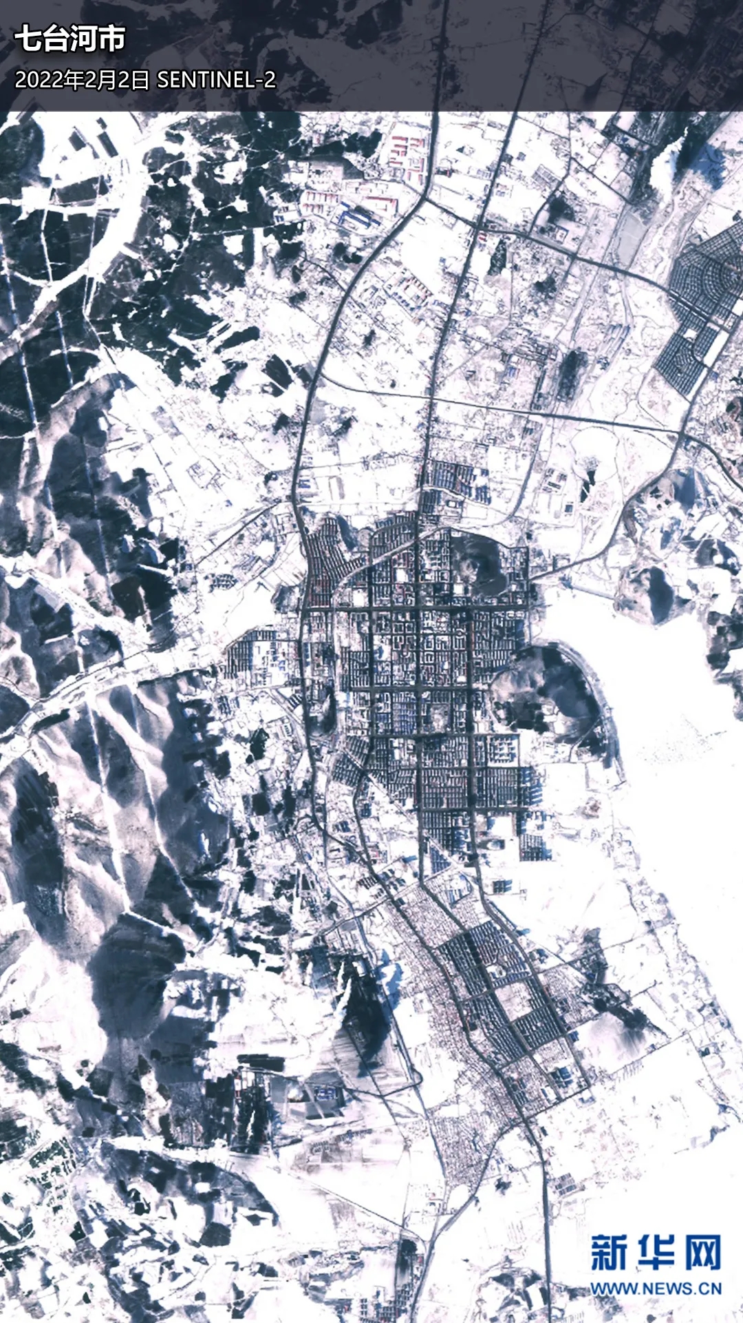 ▲卫星视角下的七台河市,2月份的小城被冰雪覆盖。卫星数据来源:SENTINEL-2