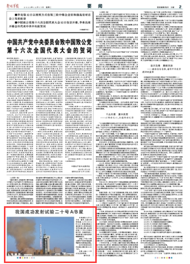 解放军报酒泉12月12日电 喻伟、记者王凌硕报道:12月12日16时22分,我国在酒泉卫星发射中心使用长征四号丙运载火箭,成功将试验二十号A/B星发射升空,卫星顺利进入预定轨道,发射任务获得圆满成功。