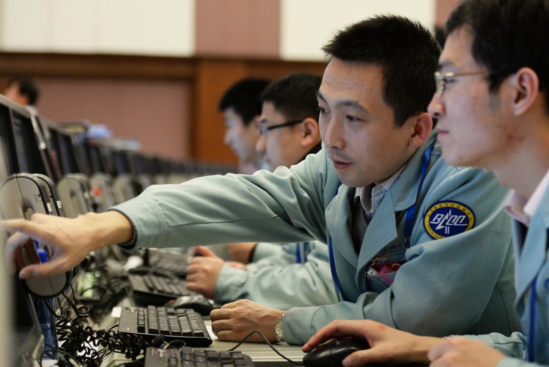 于天一(右二)在北京航天飞行控制中心指挥大厅参加嫦娥三号任务(2013年12月10日摄)。新华社发(王永亮 摄)