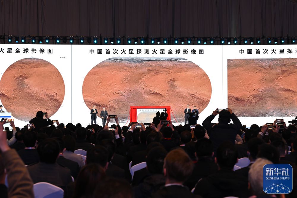 4月24日,在2023年“中国航天日”主场活动启动仪式上,国家航天局和中国科学院联合发布中国首次火星探测火星全球影像图。新华社记者 黄博涵 摄