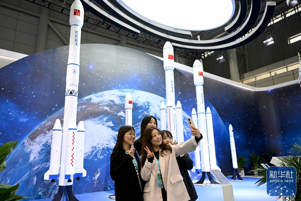 4月24日,观众在2023年“中国航天日”科普展览上合影留念。新华社记者 黄博涵 摄