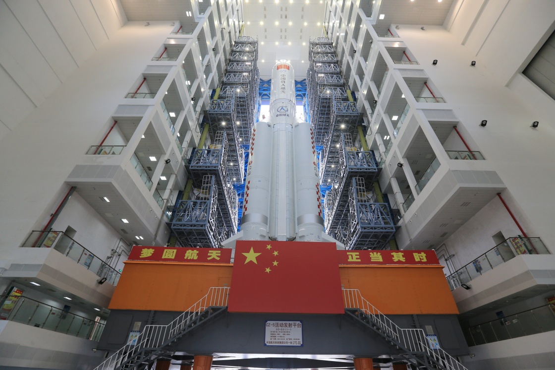 10月25日,梦天实验舱与长征五号B遥四运载火箭组合体在进行垂直转运前准备。新华社发(屠海超 摄)