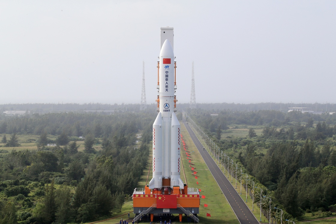 10月25日,梦天实验舱与长征五号B遥四运载火箭组合体在转运途中。新华社发(屠海超 摄)