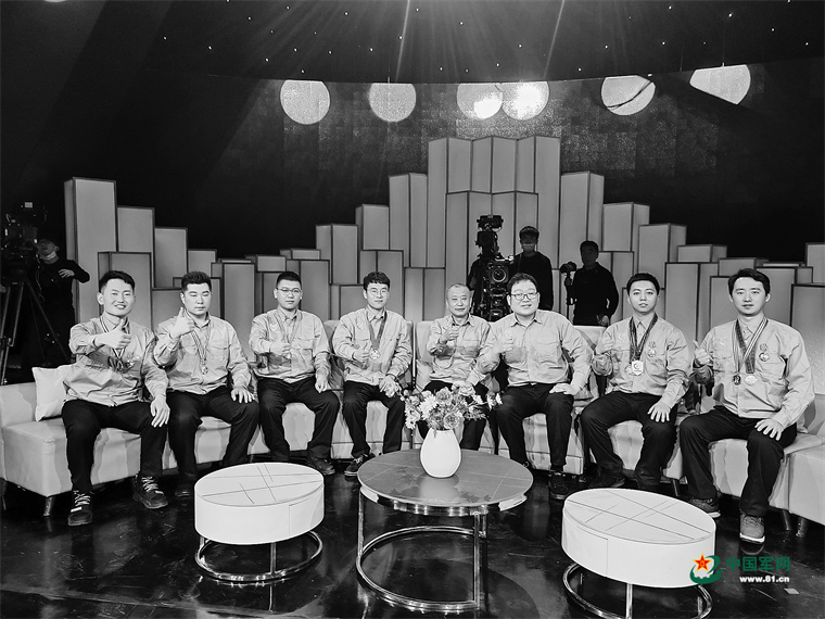 在一次央视的访谈节目上,方文墨(右三)与付红安(右四)与“文墨班”青年工匠们合影。 作者供图