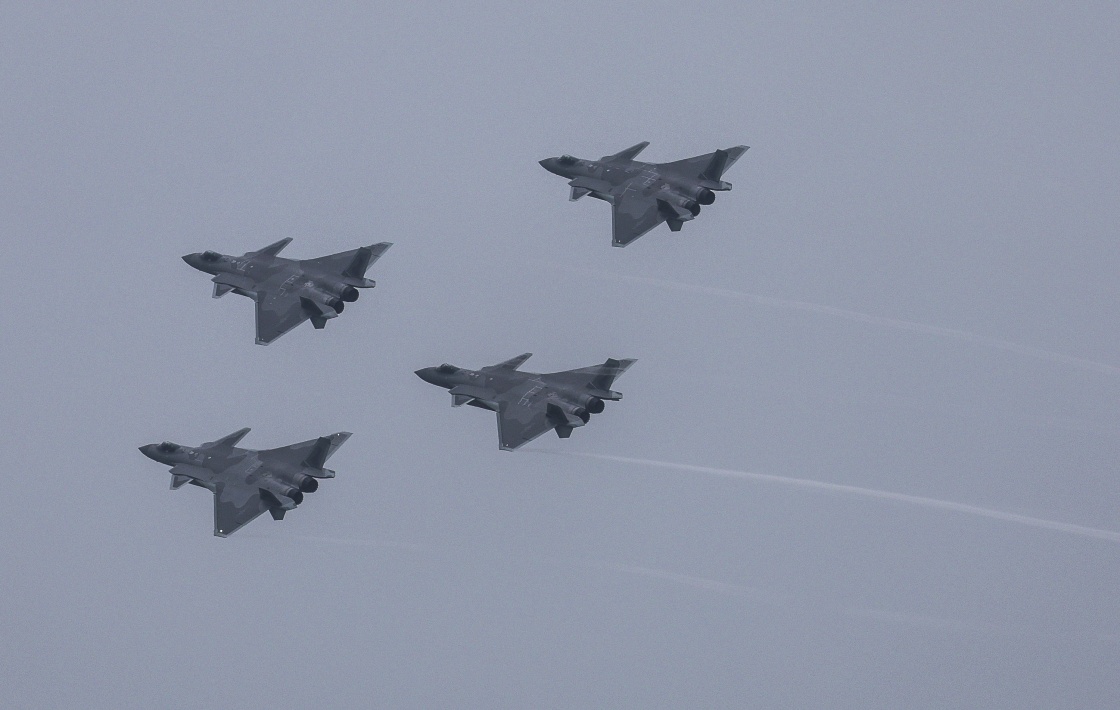 11月8日,歼-20四机编队在第十四届中国航展进行飞行表演。