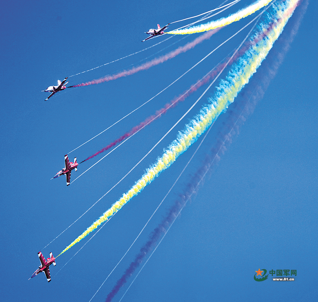 飞行表演不仅是一项绚丽多彩的飞行活动,威武雄壮的空中仪仗,更是一个展现大国气度、军队风采的亮丽窗口。彩色烟带勾勒壮美航迹!7架飞机将彩色烟带洒向蓝天,空军两支飞行表演队圆满完成各种动作,聚焦战机凯旋的目光愈加热切……