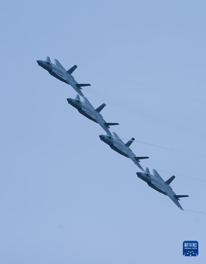 11月11日,歼-20战机四机编队在第十四届中国航展上进行飞行展示。新华社发(谭巳成 摄)