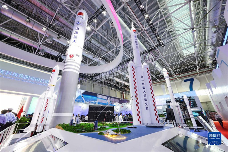 中国新一代运载火箭家族模型——捷龙三号运载火箭、长征六号改运载火箭、新一代载人运载火箭、重型运载火箭、长征五号B运载火箭亮相中国航展(11月9日摄)。