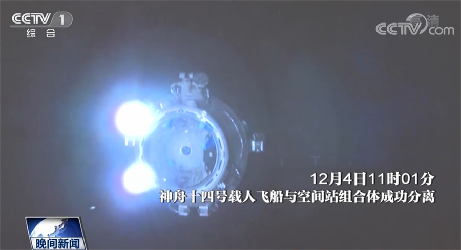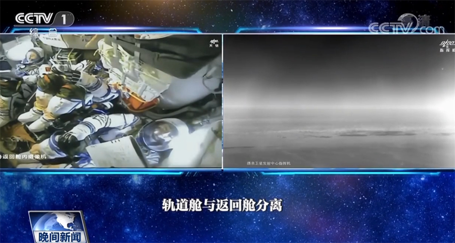19时20分,北京航天飞行控制中心通过地面测控站发出返回指令,神舟十四号载人飞船轨道舱与返回舱成功分离。此后,飞船返回制动发动机点火,返回舱与推进舱分离。