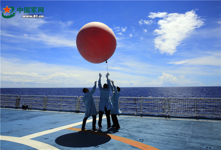 远望5号船岗位人员利用晴朗的天气施放信标球。王煦之 摄
