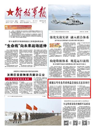 11月24日,嫦娥五号探测器发射入轨,经历地月转移、近月制动、在轨分离、平稳落月、钻表取样、月面起飞、交会对接及样品转移、环月等待、月地转移、再入回收等阶段,在轨工作23天,返回器携带月球样品于12月17日在内蒙古四子王旗预定区域着陆。此后,嫦娥五号返回器安全运抵北京,完成了开舱及相关处理工作,科技人员顺利取出了月球样品容器。