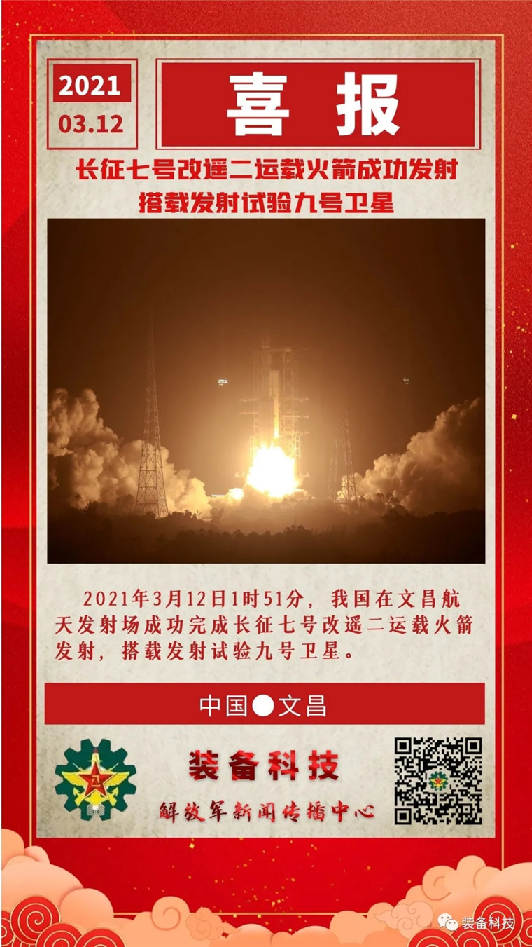 解放军报文昌3月12日电(记者安普忠、王凌硕)今天1时51分,我国在文昌航天发射场成功完成长征七号改遥二运载火箭发射,该运载火箭由长征七号运载火箭改进研制而成,用于发射地球同步轨道卫星,运载能力不少于7吨。