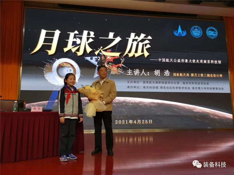 活动现场,刚刚受聘为中国航天公益形象大使的探月工程三期总设计师胡浩,向现场近500名小学生、家长、大学生科普志愿者及社区群众,生动形象、深入浅出地做了专题讲座《月球之旅》。胡浩总师播放了嫦娥五号任务实施过程中拍摄的珍贵影像,并从月球简介、月球起源、月球探测三个方面,用大量能够引起青少年兴趣的各类图片,为在座的观众讲述了中国探月“三步走”战略规划,回顾了探月工程历次任务,展望了中国探月的后续发展,并在现场回答了小学生、大学生科普志愿者的提问。在场观众热情高涨、意犹未尽,争先与胡浩总师合影留念,并期待更多科普活动。