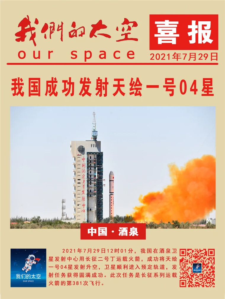 北京时间2021年7月29日12时01分,我国在酒泉卫星发射中心用长征二号丁运载火箭,成功将天绘一号04星发射升空,卫星顺利进入预定轨道,发射任务获得圆满成功。