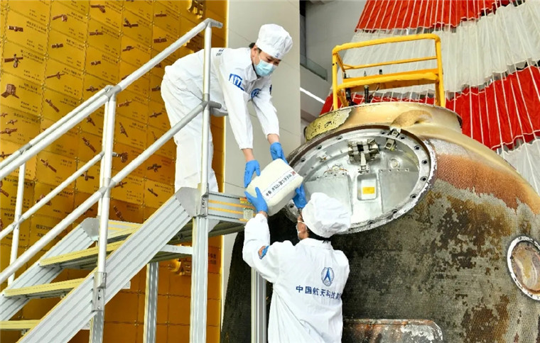 工作人员开舱取出搭载物品