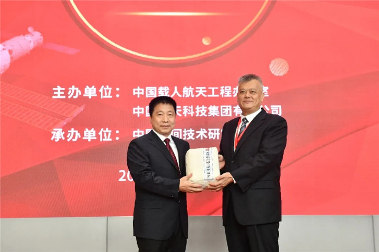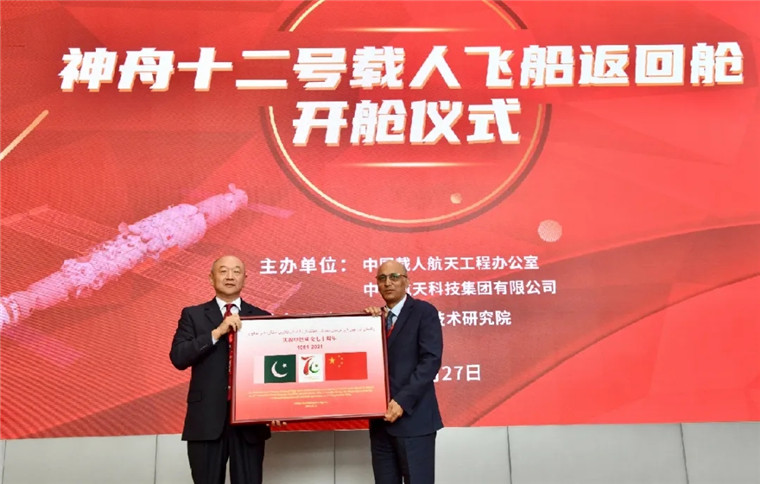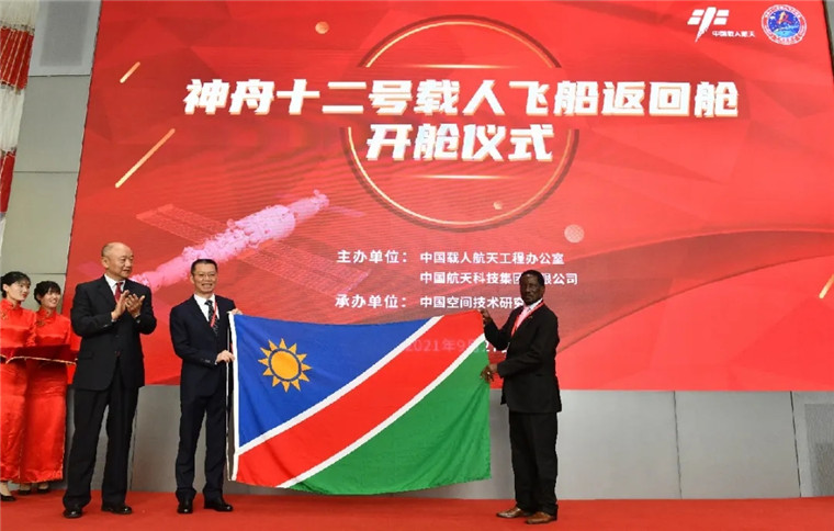 开舱仪式现场,中国载人航天工程办公室主任郝淳,我国首飞航天员、航天英雄、载人航天工程副总设计师杨利伟,西安卫星测控中心副主任方旭来等,分别向巴基斯坦驻华代表移交搭载的中巴旗帜和证书,向纳米比亚驻华代表移交搭载的纳米比亚国旗和证书,向中国关心下一代工作委员会移交青少年科普试验物品,向云南省、宁夏回族自治区、航天育种产业创新联盟等移交搭载的特色作物种子。