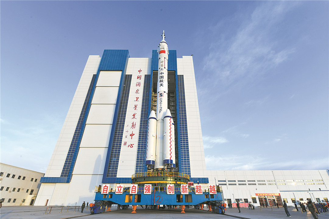 10月7日,神舟十三号载人飞船与长征二号F遥十三运载火箭组合体准备转往发射区。新华社发