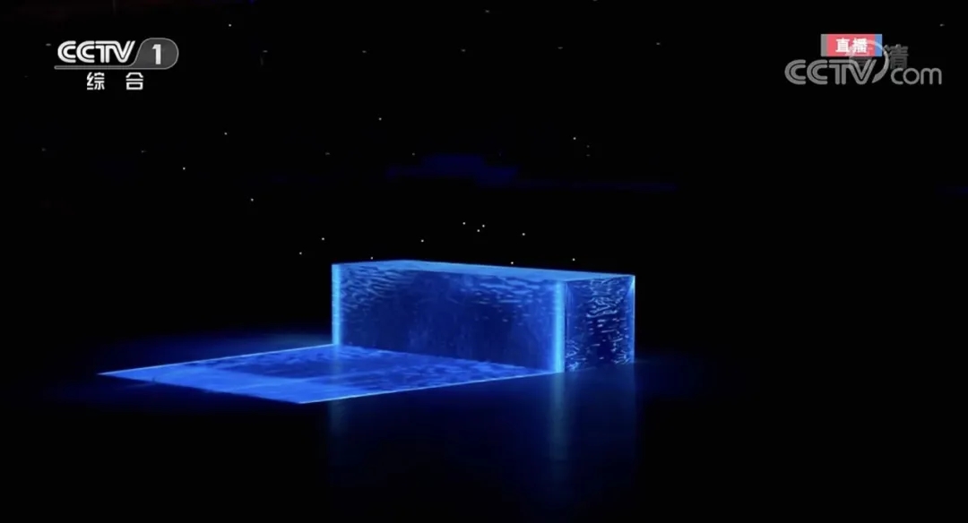 开幕式上,人们看到,在舞台中央偏东侧位置,冰立方缓缓地升了起来。升起来之前,它“藏”在一个巨大的地仓里,地仓长度是84米,宽42米,深度是10米。
