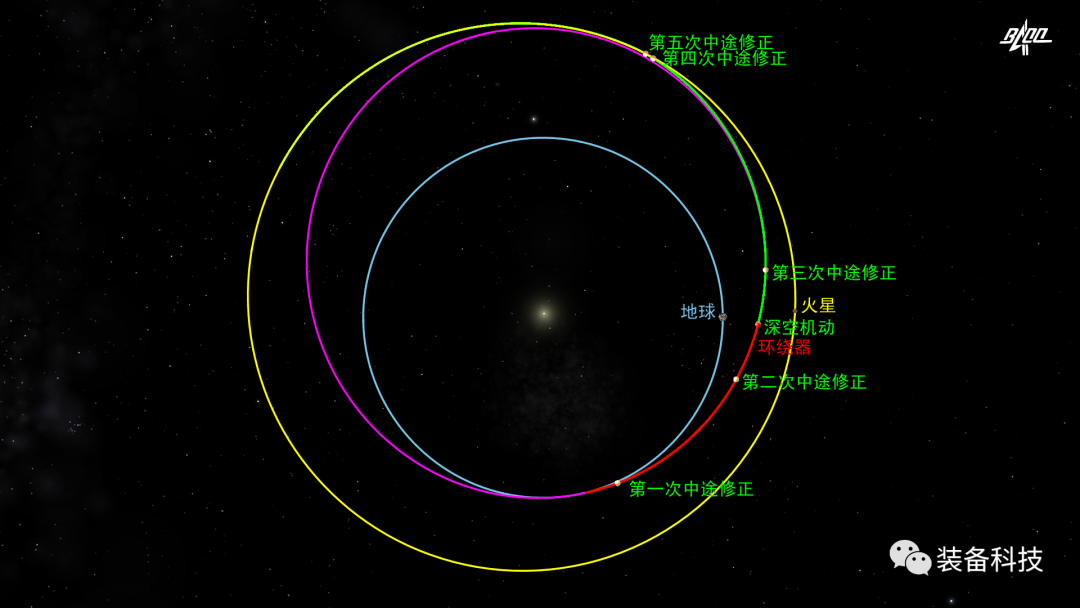 为了减小飞行偏差,使探测器沿着预定的轨道飞行而进行的轨道控制称作修正。改变探测器当前轨道,使其进入一条新的轨道而进行的轨道控制称作机动。此次轨道机动在距离地球大约 2940 万千米的深空实施。天问一号的轨道设计,综合考虑了从发射到火星捕获的各种约束条件并使推进剂消耗尽可能小,采取了转移过程中进行一次深空机动的策略。